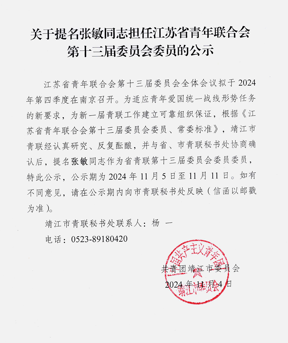 江蘇省青年聯(lián)合會(huì)第十三屆委員會(huì)全體會(huì)議擬于2024年第四季度在南京召開(kāi)。為適應(yīng)青年愛(ài)國(guó)統(tǒng)一戰(zhàn)線(xiàn)形勢(shì)任務(wù)的新要求,為新一屆青聯(lián)工作建立可靠組織保證,根據(jù)《江蘇省青年聯(lián)合會(huì)第十三屆委員會(huì)委員、常委標(biāo)準(zhǔn)》,靖江市青聯(lián)經(jīng)認(rèn)真研究、反復(fù)醞釀,并與省、市青聯(lián)秘書(shū)處協(xié)商確認(rèn)后,提名張敏同志作為省青聯(lián)第十三屆委員會(huì)委員委員,特此公示